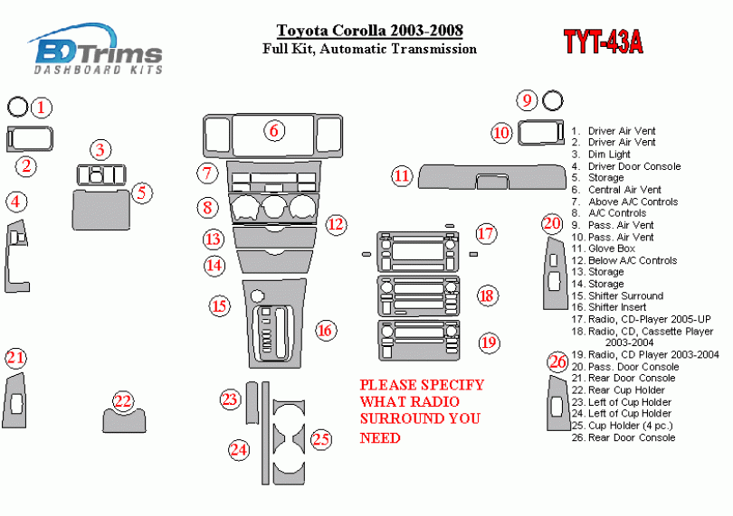Toyota Corolla 2003 - 2008 Dash Trim Kit