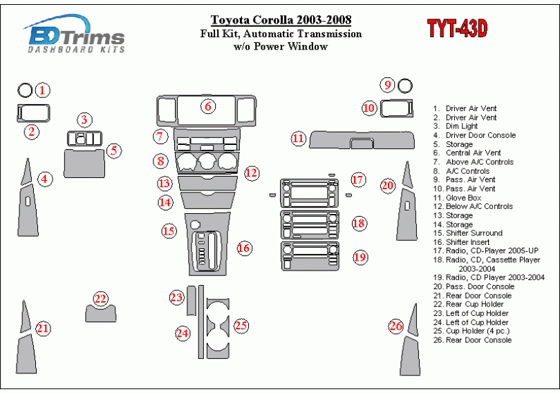 Toyota Corolla 2003 - 2008 Dash Trim Kit