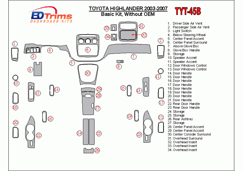 Toyota Highlander 2003 - 2007 Dash Trim Kit