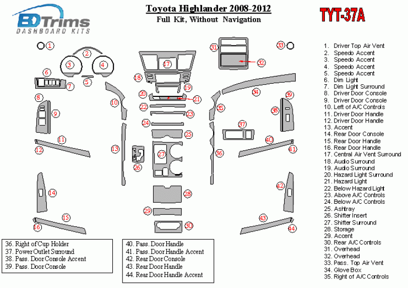 Toyota Highlander 2008 - 2012 Dash Trim Kit