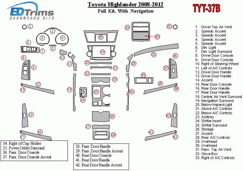 Toyota Highlander 2008 - 2012 Dash Trim Kit